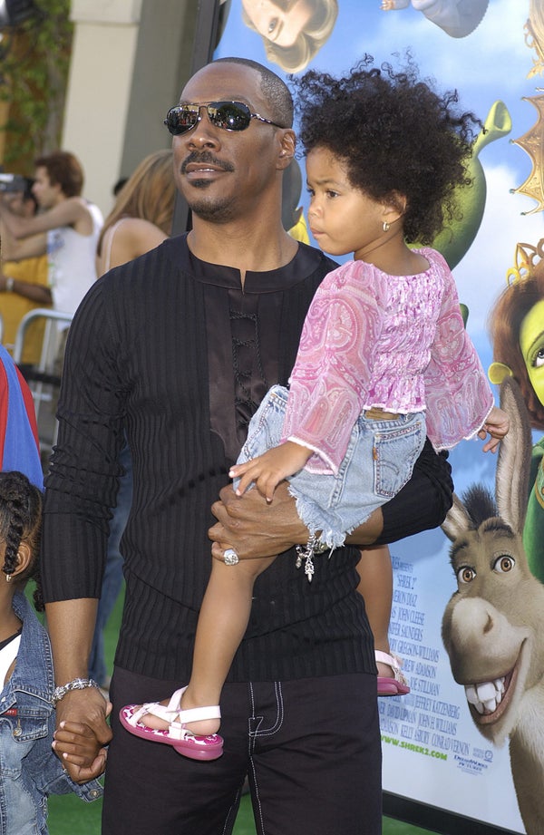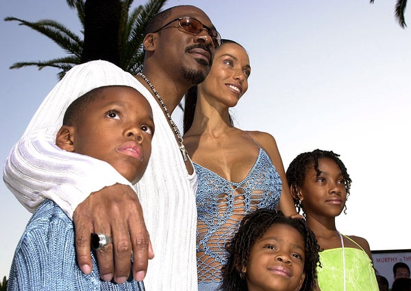 Eddie Murphy arrives at the premiere of Nutty Professor Two with his family (From L-R): son Myles, Eddie, ex wife Nicole, girl Shane, daughter Bria, in July 2000.
